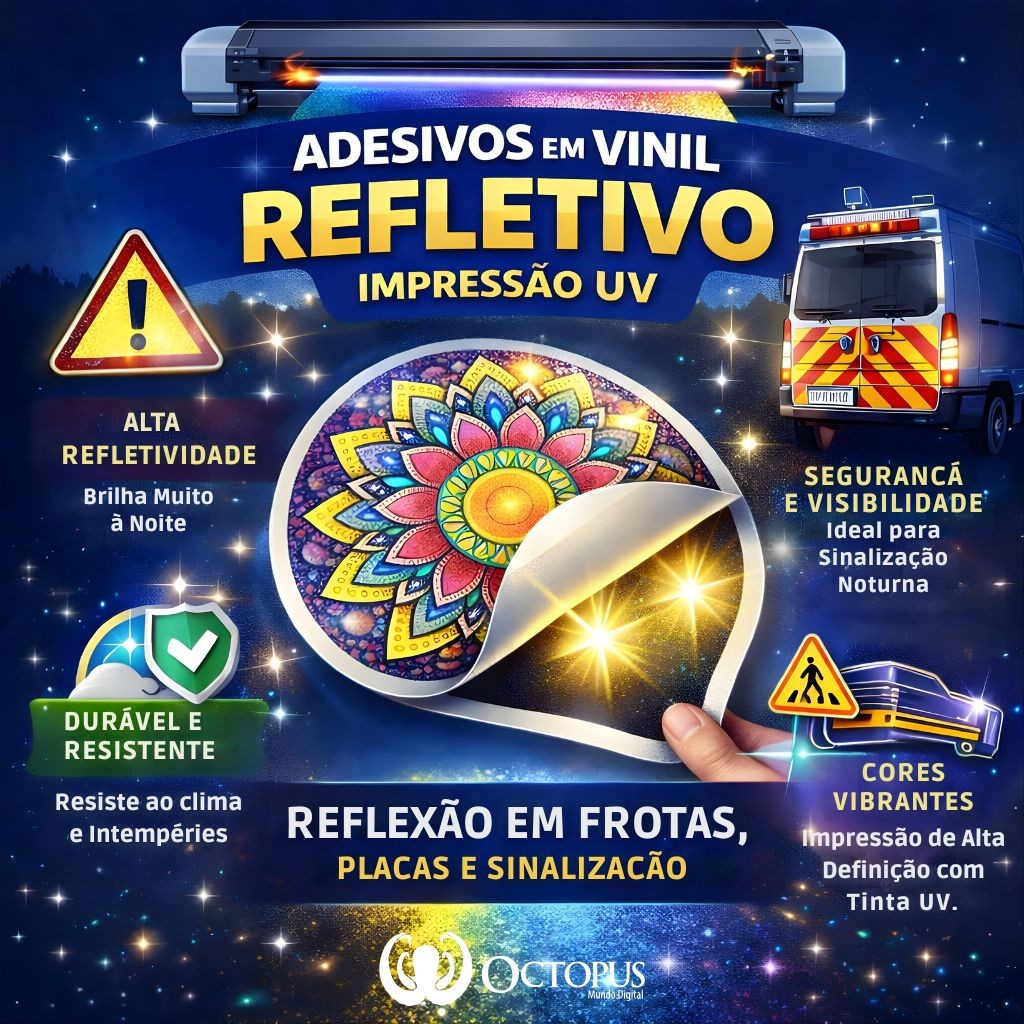 Se você precisa de um adesivo que una segurança, durabilidade e impacto visual, o vinil refletivo com impressão UV é a escolha certa para valorizar sua comunicação visual e garantir destaque em qualquer condição de iluminação.